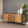 Dit grote dressoir Gwenn is niet alleen ontzettend ruim, het heeft ook nog eens een fantastisch uiterlijk! De deurtjes van de kast zijn op een schitterende manier met een visgraatmotief ingelegd en het metalen frame van de kast loopt door tot de poten, waardoor het lijkt of er meer ruimte ontstaat in de ruimte! De kast beschikt aan beide zijkanten over twee deurtjes, waarachter twee vakken zitten achter elk deurtje. In het midden zitten dan vier ruime lades waarin kleinere voorwerpen kunnen worden opgeborgen.