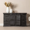 Het massieve mangohout wordt eerst gezandstraald, daarna afgewerkt met zwarte verfbeits met daaroverheen een donkere bijenwas op natuurlijke wijze. Hierdoor is het dressoir makkelijk afneembaar met een vochtige doek zodat de kwaliteit van het hout langer behouden blijft. De stalen schuifdeuren, de rails en de handgrepen worden afgewerkt met een vochtige doek.
